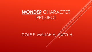 Auggie is a deformed boy born with many anomalies who is the main character of the book Wonder. He struggles to make friends due to his appearance and people making fun of him. His family, including his sister Via and parents Isabela and Nate, support him but also struggle with decisions about his education and socialization. The book is about Auggie navigating school and relationships as someone with physical disabilities.