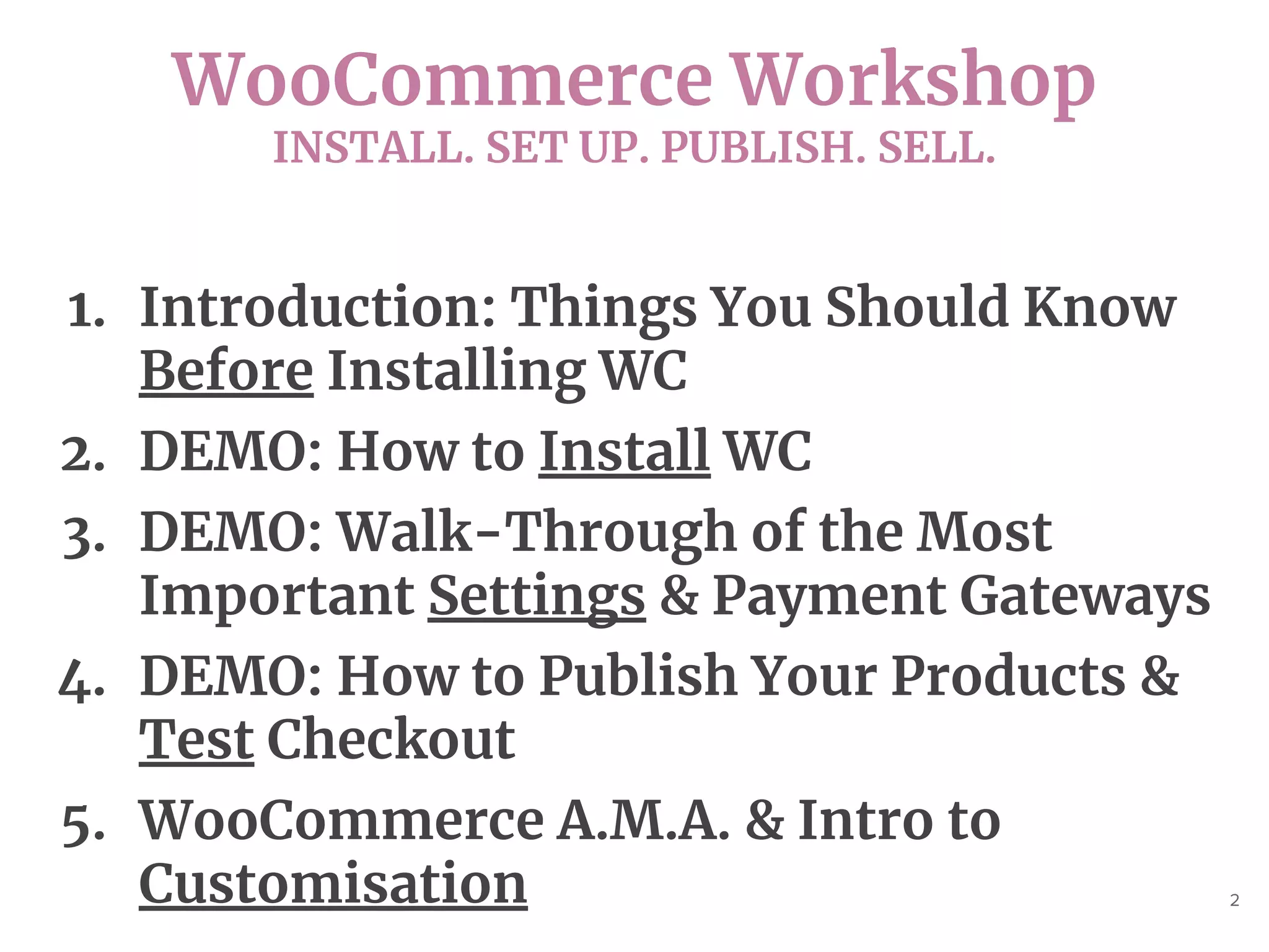 The document covers a comprehensive workshop on installing, setting up, and selling with WooCommerce, including demos on key features and settings. It emphasizes the importance of proper hosting, project management, and testing during development and maintenance phases. Additionally, it provides detailed instructions for product publishing, checkout testing, and customization options.