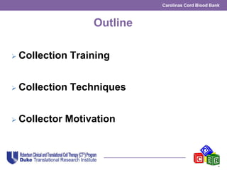 This document discusses cord blood collection training provided by the Carolinas Cord Blood Bank. It covers topics like initial and annual training requirements, collection techniques for both in utero and ex utero collection, factors that influence collection volume like collector experience and motivation, and ideas for incentivizing collectors to improve volumes. The goal is to maximize cord blood collection volumes to increase the number of units available for patients in need of transplantation.