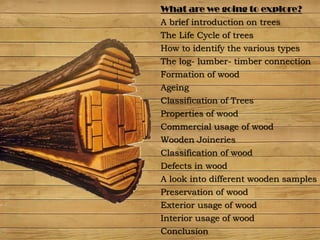 This document provides an overview of wood and trees. It discusses the structure and composition of wood. It also examines the life cycle of trees, tree identification, wood properties, commercial uses of wood, and classifications of trees and wood. The document concludes with sections on interior and exterior wood usage.