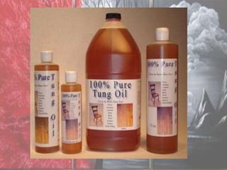 Wood finishing refers to embellishing and protecting the surface of wood. There are different types of finishes including evaporative, reactive, and coalescing. Common wood finishes are wax, shellac, polyurethane, tung oil, linseed oil, nitrocellulose lacquer, and alkyd varnish. Each finish has unique properties such as providing gloss, durability, penetrating wood, or leaving character marks.