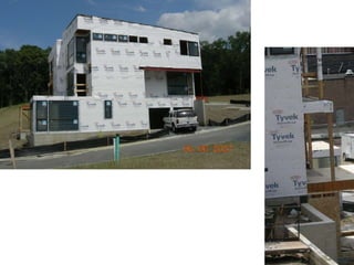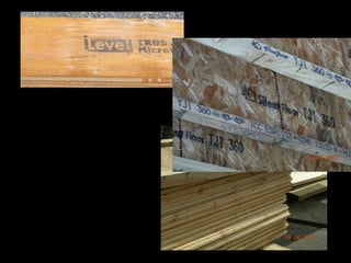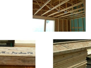The document discusses light wood frame construction methods used for floors, walls, and roofs. It describes common framing materials like wood studs, joists, and sheathing. Balloon framing and platform framing methods are explained. Key terms related to light wood frame construction are also defined.