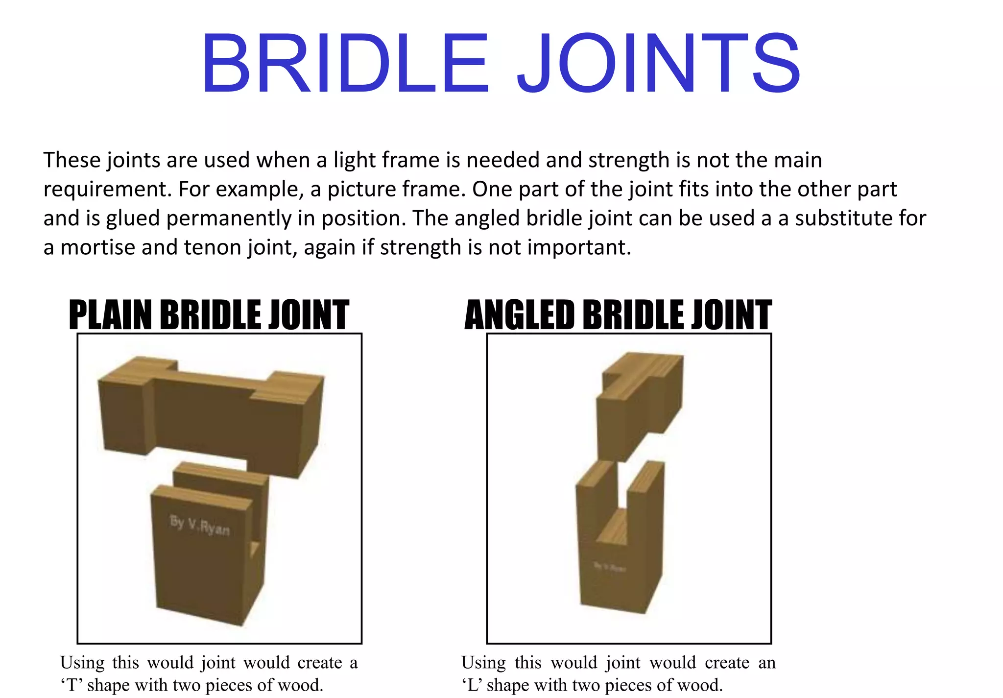 This document discusses and illustrates different types of wood joints used in light frame construction including bridle joints, butt joints, and corner rebate joints. Bridle joints are used when strength is not critical and come in plain and angled variations to form a 'T' or 'L' shape. Butt joints simply bring two ends together at a right angle and nail them for basic connections. Corner rebate joints use a shoulder or lapped configuration common for furniture and boxes, where a rebate plane or combination plane creates flush shoulders at the corners.