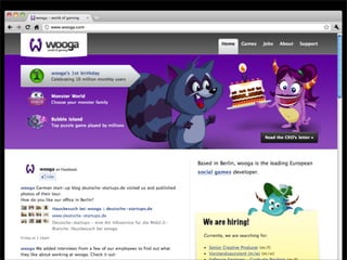 The document discusses some of the technical challenges of developing a successful Facebook game, including needing to support high numbers of daily and concurrent users, handling thousands of requests and database queries per second, and ensuring rapid and scalable growth as the game's popularity increases on the Facebook platform. It also provides an overview of the typical architecture for a Facebook game, including using an iframe within Facebook, a Flash client, a backend system, and integrating with Facebook APIs.