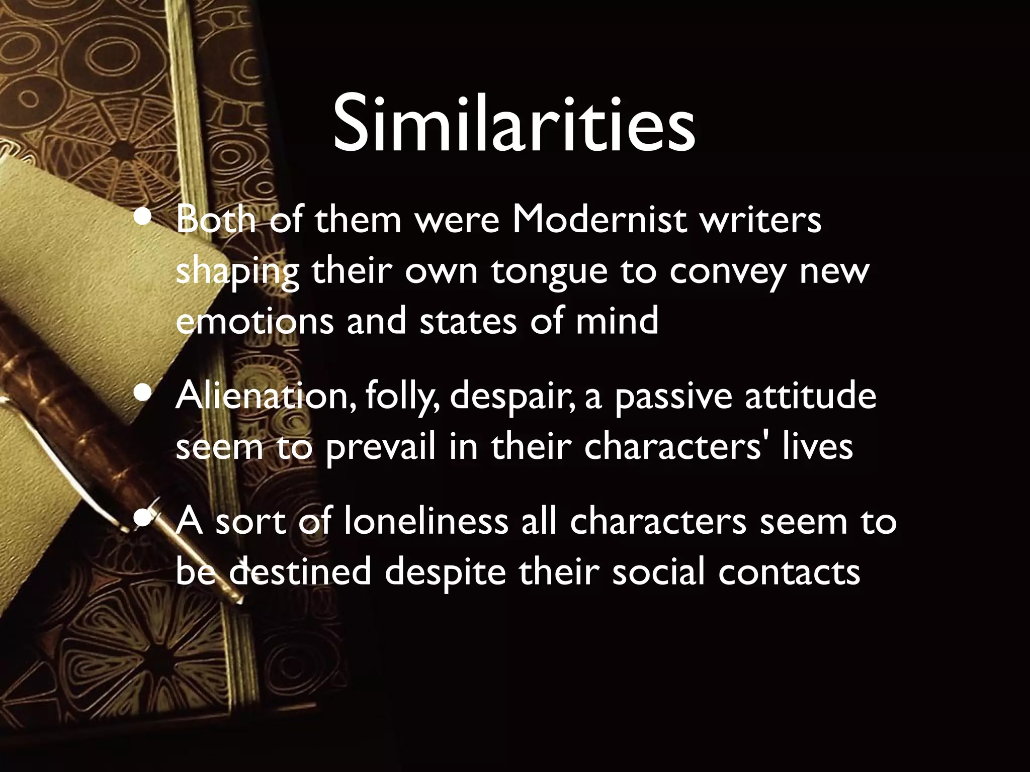 Virginia Woolf and James Joyce were both modernist writers who shared several similarities in their experimental narrative techniques and themes of alienation, despair, and loneliness depicted in their characters' lives. However, Joyce's writing was even more experimental with his characters taking on mythic dimensions not seen in Woolf's works. Additionally, religious torment was a stronger theme in Joyce's works while Woolf explored more themes like feminism and the impacts of war and neurosis. Joyce's characters were also more victims of their inner circumstances compared to Woolf's characters who attempted to adapt to outer conditions.
