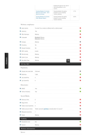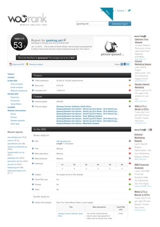 This report analyzes the website ranking and performance of gauteng.net. It finds that the average ranking so far is 48.3. The site receives between 30,000 to 100,000 visitors per month. It has 409,000 indexed pages and popular pages include those relating to tourism in Gauteng and the 2010 World Cup. The in-site SEO analysis found the site is missing key elements like a title, meta description and keywords. It has no H1-H6 headings or images.