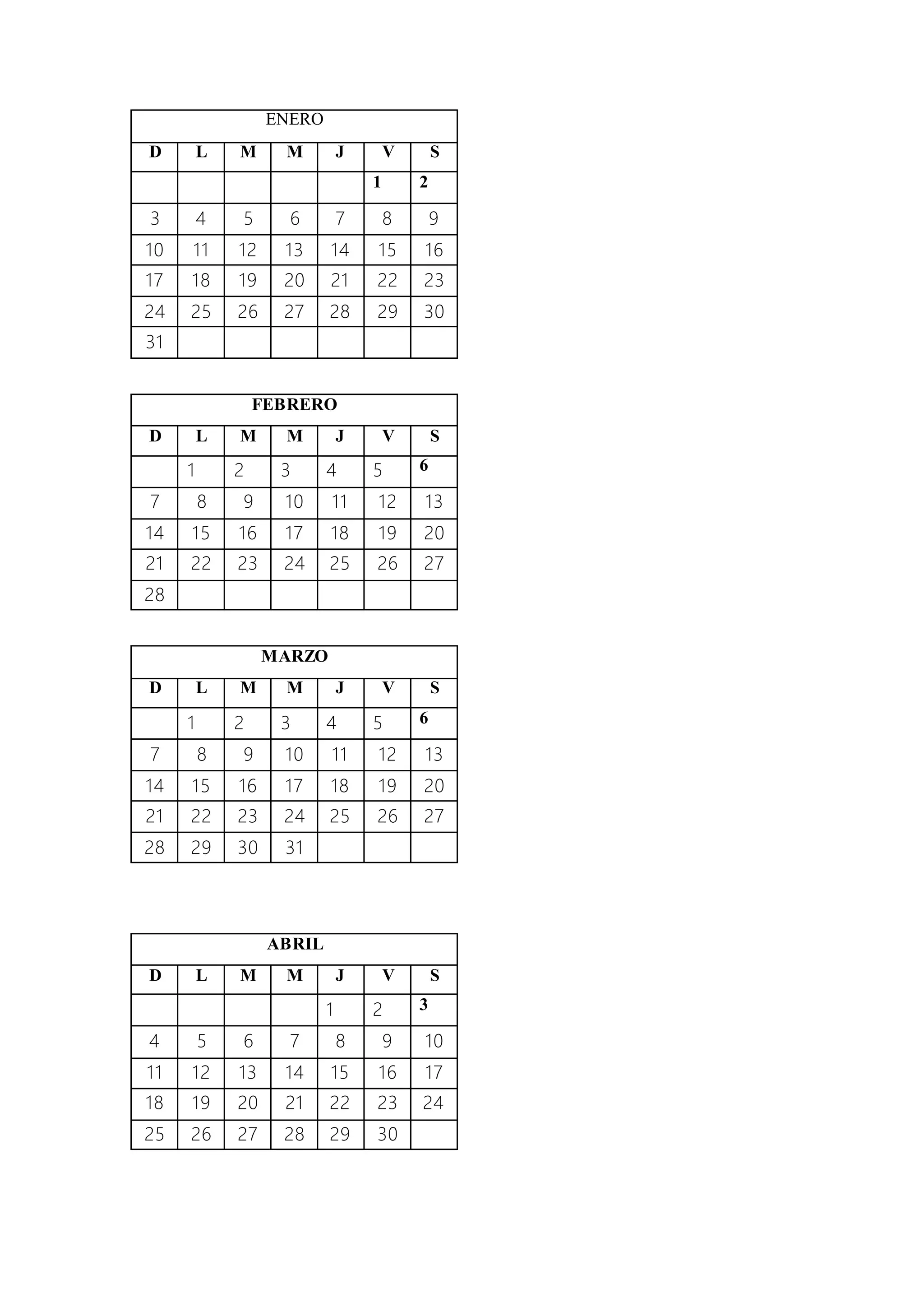 The document contains calendar listings for each month of the year, from enero (January) to diciembre (December). For each month, it lists the days of the week in abbreviated form (D, L, M, M, J, V, S) at the top and dates below with the corresponding day of the week. It provides a simple calendar view for the entire year.