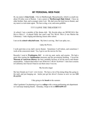 Gina Grady is a junior at Marlborough High School in Massachusetts who loves theater and musicals. She is involved in her school's drama club and volleyball team, works part-time at her father's movie theater, and hopes to study performing arts in college with a goal of performing on Broadway someday.