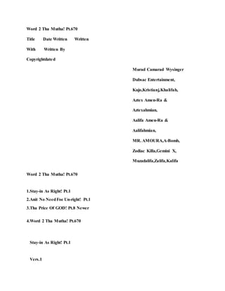1. The document appears to be lyrics for rap songs titled "Stay-in As Right! Pt.1", "Anit No NeedFoe Un-right! Pt.1", "Tha Price Of GOD! Pt.8 Newer", and "Word 2 Tha Mutha! Pt.670".