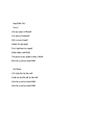 1. This document appears to be lyrics for a hip hop album containing 7 songs: "Sun COD!", "What It Do!", "Tha Price Of Cuzz!", "Word 2 Tha Mutha!", "Heaven Instead!", "Under Ced!", and the intro.
