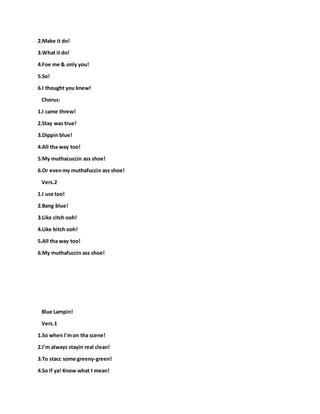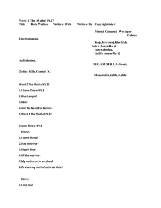 1. The document appears to be lyrics from a rap album titled "Word 2 Tha Mutha! Pt.27" containing 5 songs: "I Came Threw! Pt.2", "Blue Lampin!", "83rd!", "Anit No NeedFoe Nothin!", and the title track "Word 2 Tha Mutha! Pt.27".