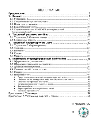Документ является учебным пособием по работе с текстовыми редакторами и текстовым процессором Word 2003, предоставляя последовательные инструкции по выполнению различных операций с текстом. В нем рассматриваются основные функции блокнота, WordPad и Word, включая форматирование, редактирование и работу с файлами. Пособие акцентирует внимание на методике постепенного освоения навыков и умений, с соблюдением принципов дидактики.