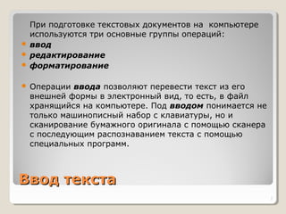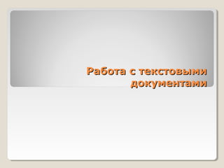 Документ описывает основные операции работы с текстовыми документами, включая ввод, редактирование и форматирование текста. Он также рассматривает программное обеспечение, используемое для работы с текстом, такие как текстовые редакторы и текстовые процессоры, а также параметры страницы и режимы отображения. В документе изложены основные правила ввода текста и способы редактирования, включая копирование и перемещение текстовых фрагментов.