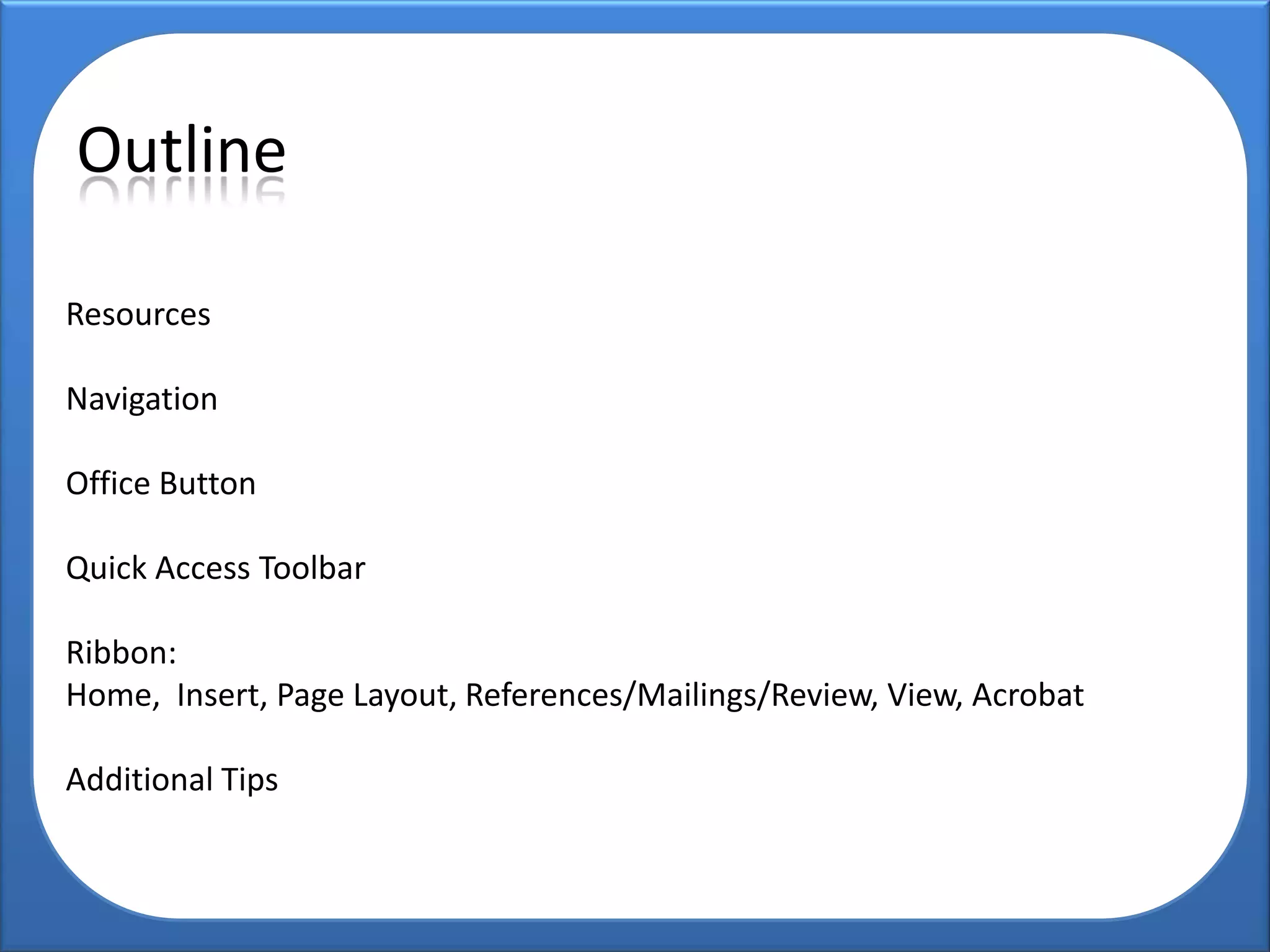 The document provides an outline of resources available for using Microsoft Word 2007, detailing the navigation and functionalities of the ribbon, office button, and quick access toolbar. It includes instructions on setting the default save option, using keyboard shortcuts, and additional tips for creating PDFs. Links to further resources and training schedules are provided for faculty at Fordham University.