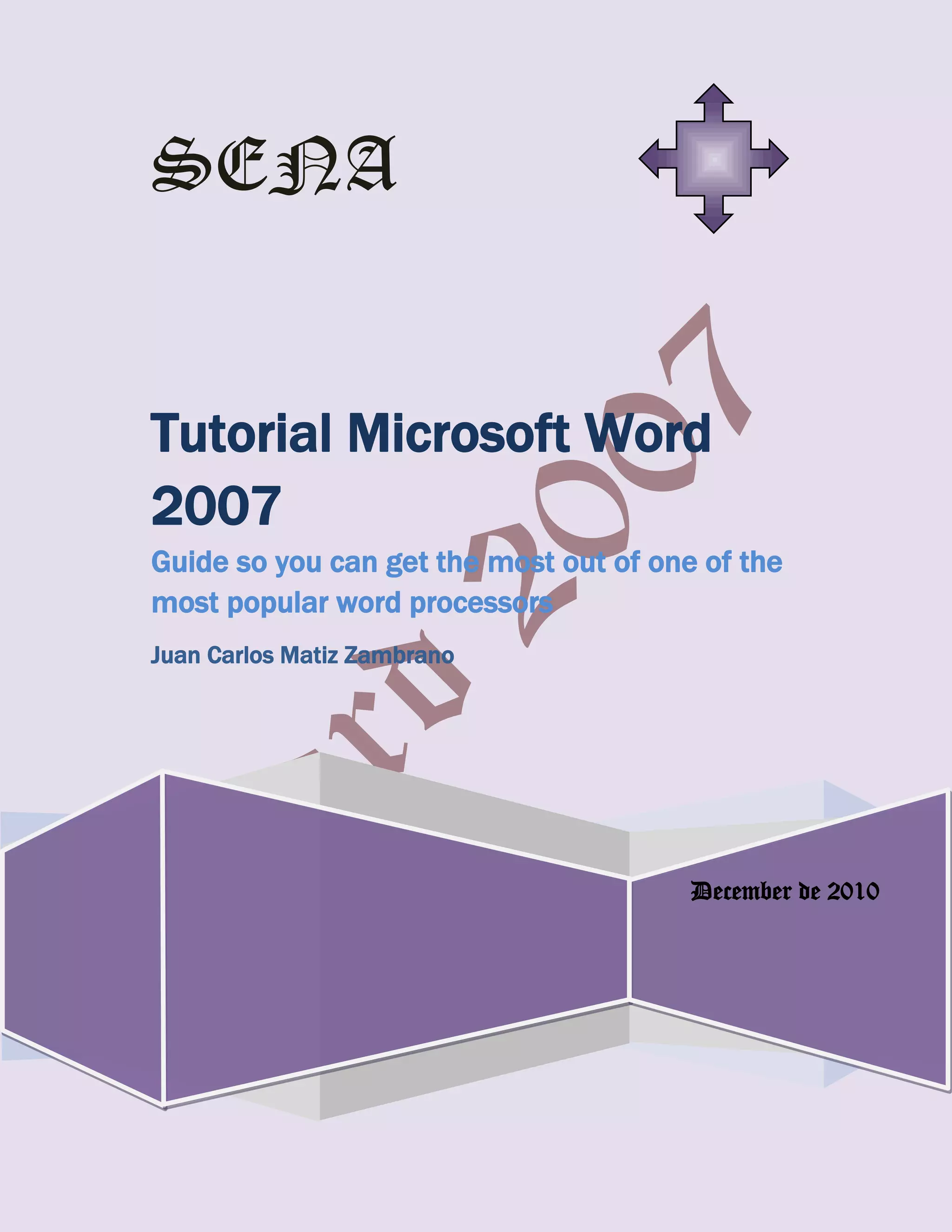 This guide provides instructions for how to use various features in Microsoft Word 2007, including how to open and close Word, work with the ribbon tabs, save or open files, insert styles like WordArt, tables, bullets and symbols, format text, set up page layouts, insert equations, charts, comments, and watermarks. The document demonstrates how to get the most out of Word's capabilities for creating professional documents.