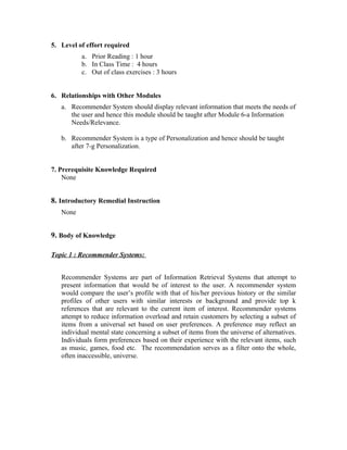 This document provides an overview of a module on recommender systems for a digital library curriculum. The module aims to teach students about different recommender system approaches, including content-based, collaborative filtering, and hybrid systems. It also covers challenges in recommender system design and the use of user profiles. The key topics covered include recommender system types and techniques, challenges in collaborative filtering, and modeling user profiles both explicitly and implicitly.