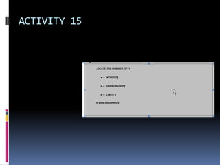 This document provides instructions for various activities and functions in Microsoft Word, including: