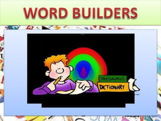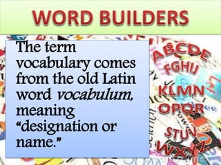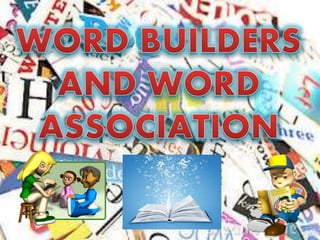 The document discusses various types of word relationships and vocabulary concepts. It defines terms like collocations, clines, clusters, configuration, creativity, context, clipping, and relationships between words through similarity, contrast, cause and effect, part to whole, classification, predication, derivation, sound, modification, completion, and association. Examples are provided to illustrate each concept. The purpose is to analyze different ways words can be related or grouped together through meaning, sound, structure, or association.