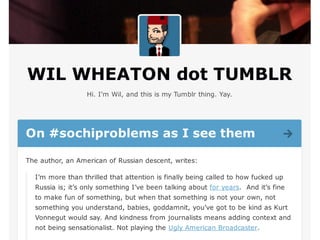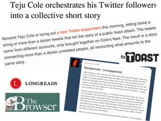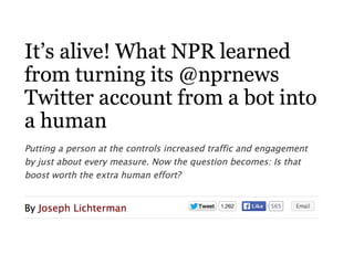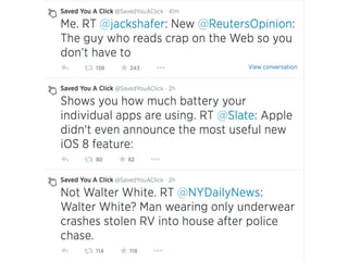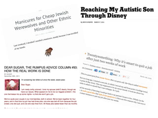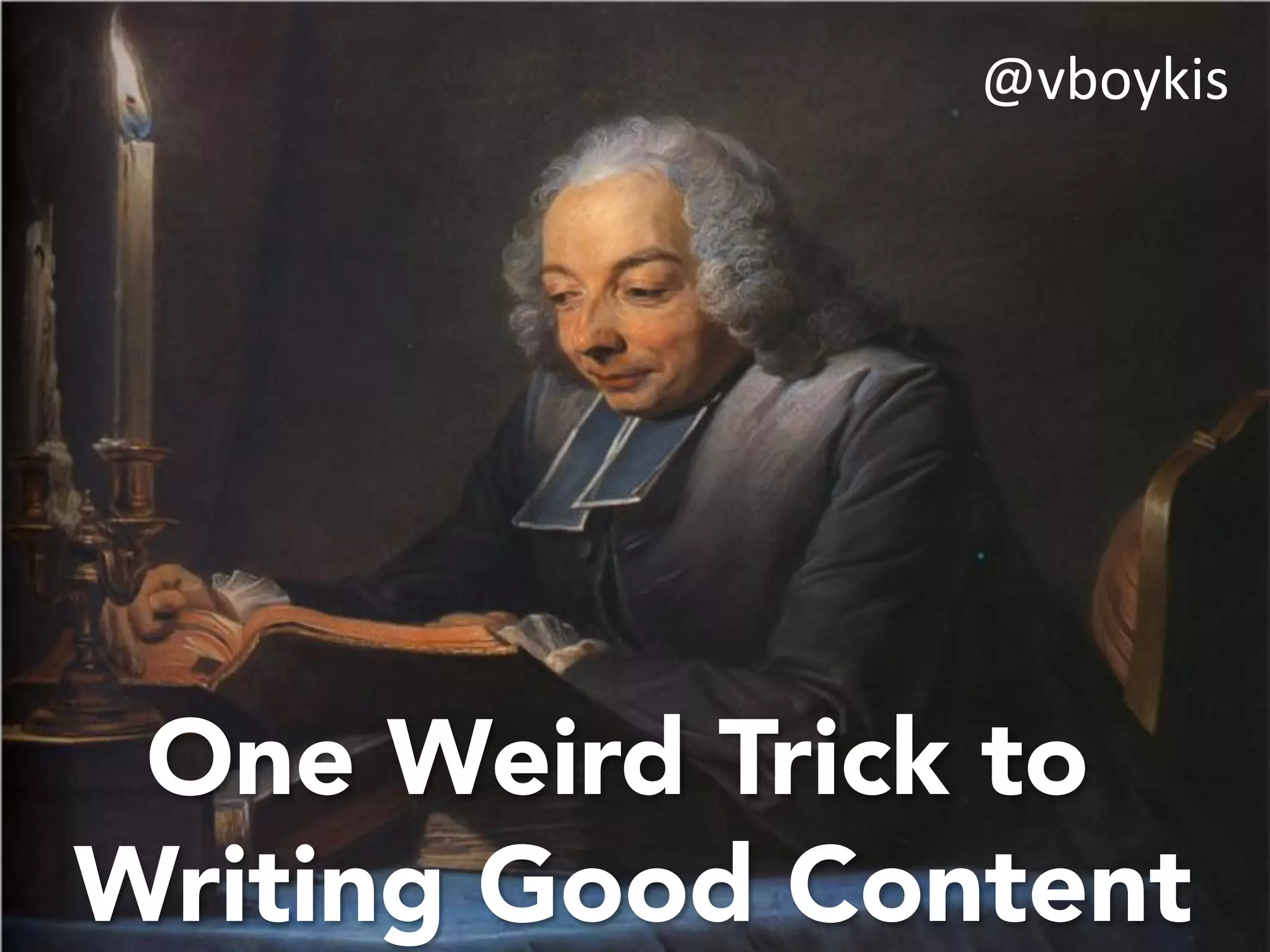 This document discusses one weird trick for writing good content: telling genuine stories consistently and sharing your work with others. It recommends being authentic, posting content regularly, and reading what others create. Resources for blogging such as certain writers and publications are also listed.