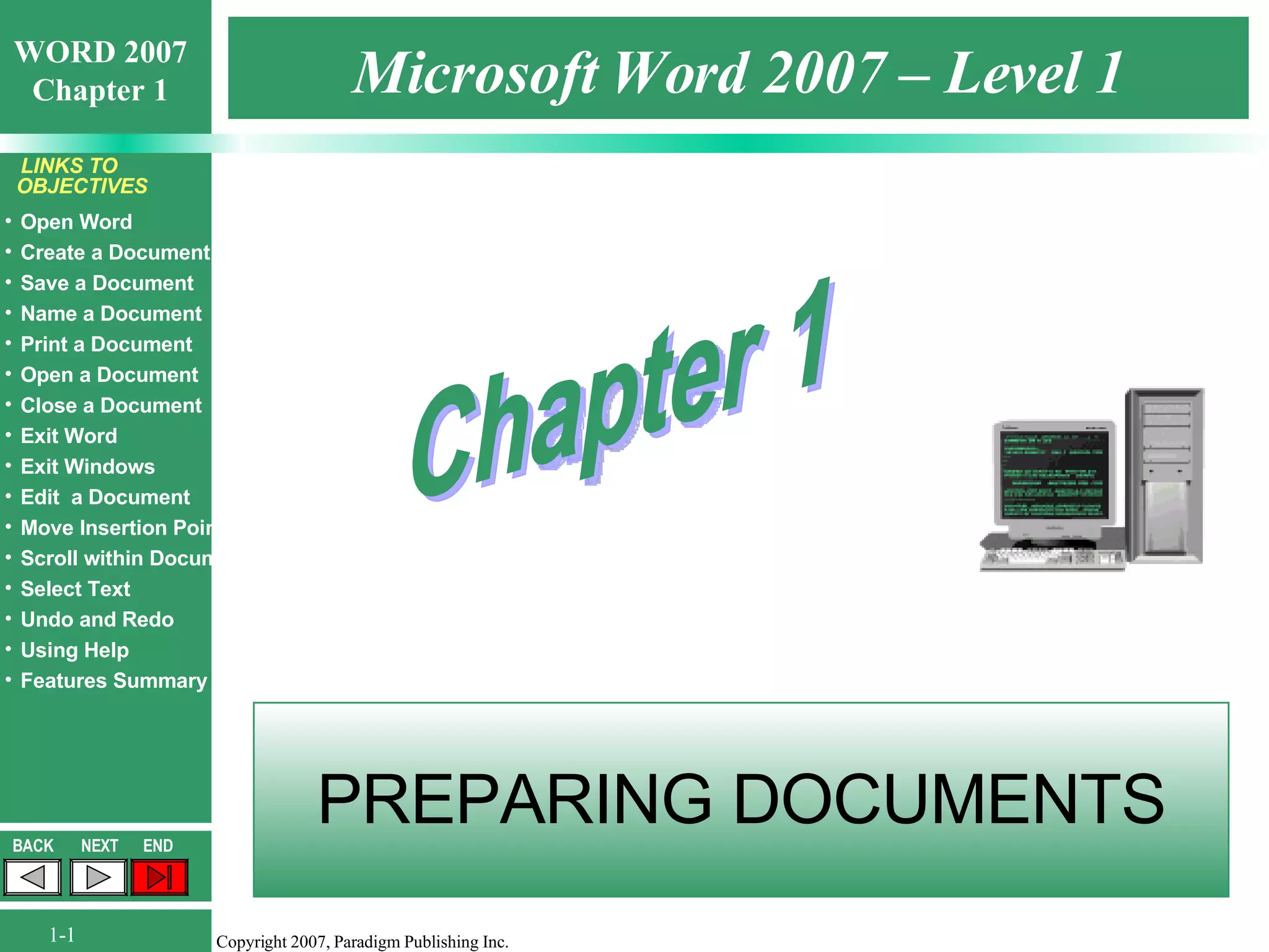 This document provides an overview of basic functions in Microsoft Word 2007 including how to open, create, save, print, and close documents. It also reviews how to edit text by moving the insertion point, selecting text, undoing and redoing actions. Additional topics covered are checking spelling and grammar, using help, and scrolling within a document. Formatting characters and paragraphs will be covered in the next chapter.