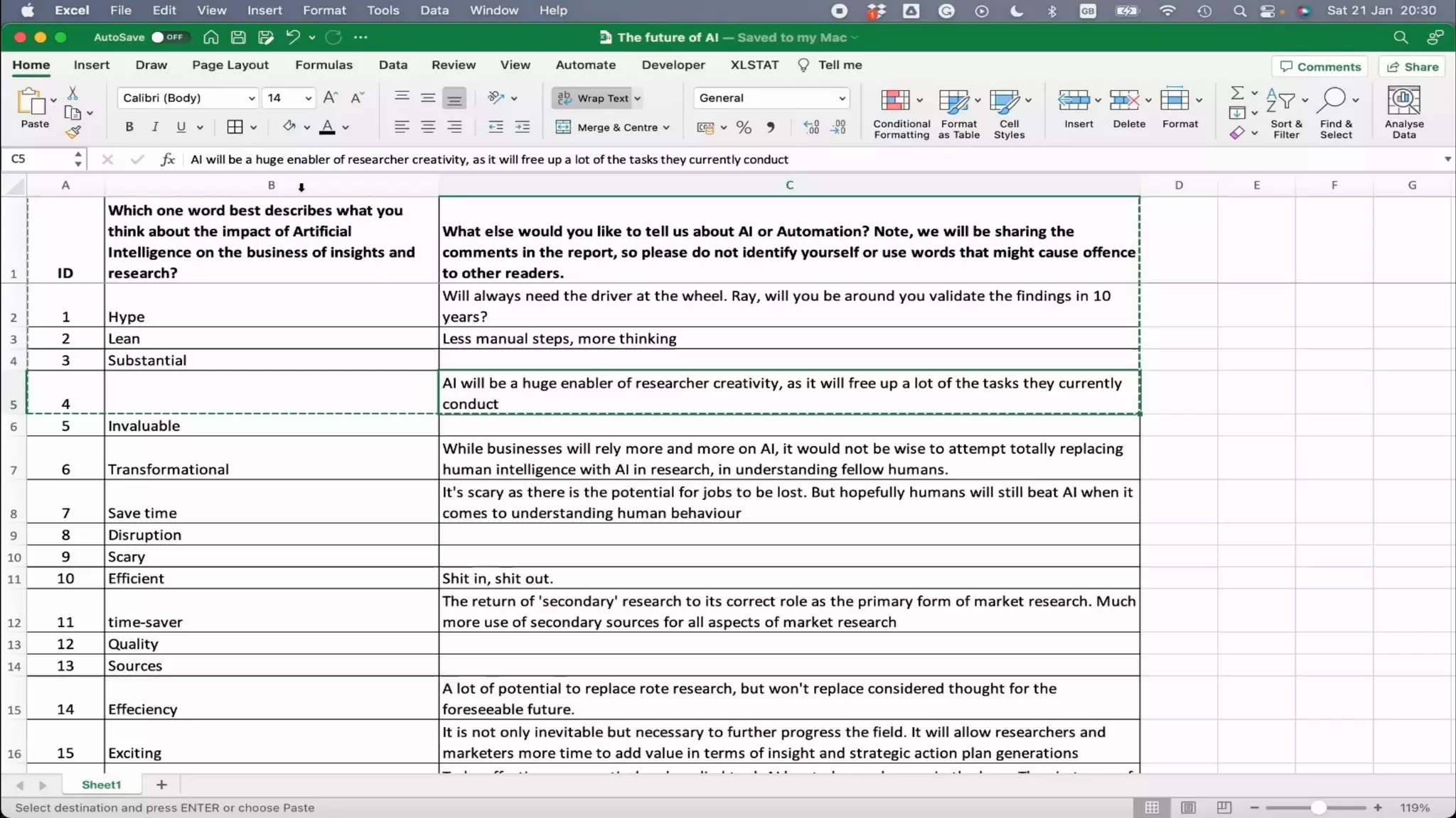 The January 2023 webinar on analyzing text with Word Cloud Plus featured discussions led by Ray Poynter, covering topics like AI's impact on research, data cleaning, and analysis refinement. Participants engaged in questions around the role of AI in enhancing researcher creativity while acknowledging the need for human insight in research. Closing announcements included future webinars and thanks to sponsors.