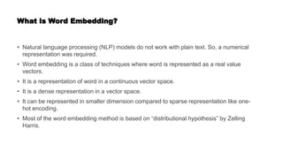 Word embeddings are numerical representations of words in a continuous vector space, crucial for natural language processing (NLP) tasks. These embeddings capture semantic relationships and can be generated through techniques like co-occurrence matrices, dimensionality reduction, and neural networks. Popular models include word2vec and GloVe, each with representation approaches that impact context understanding and embedding efficiency.
