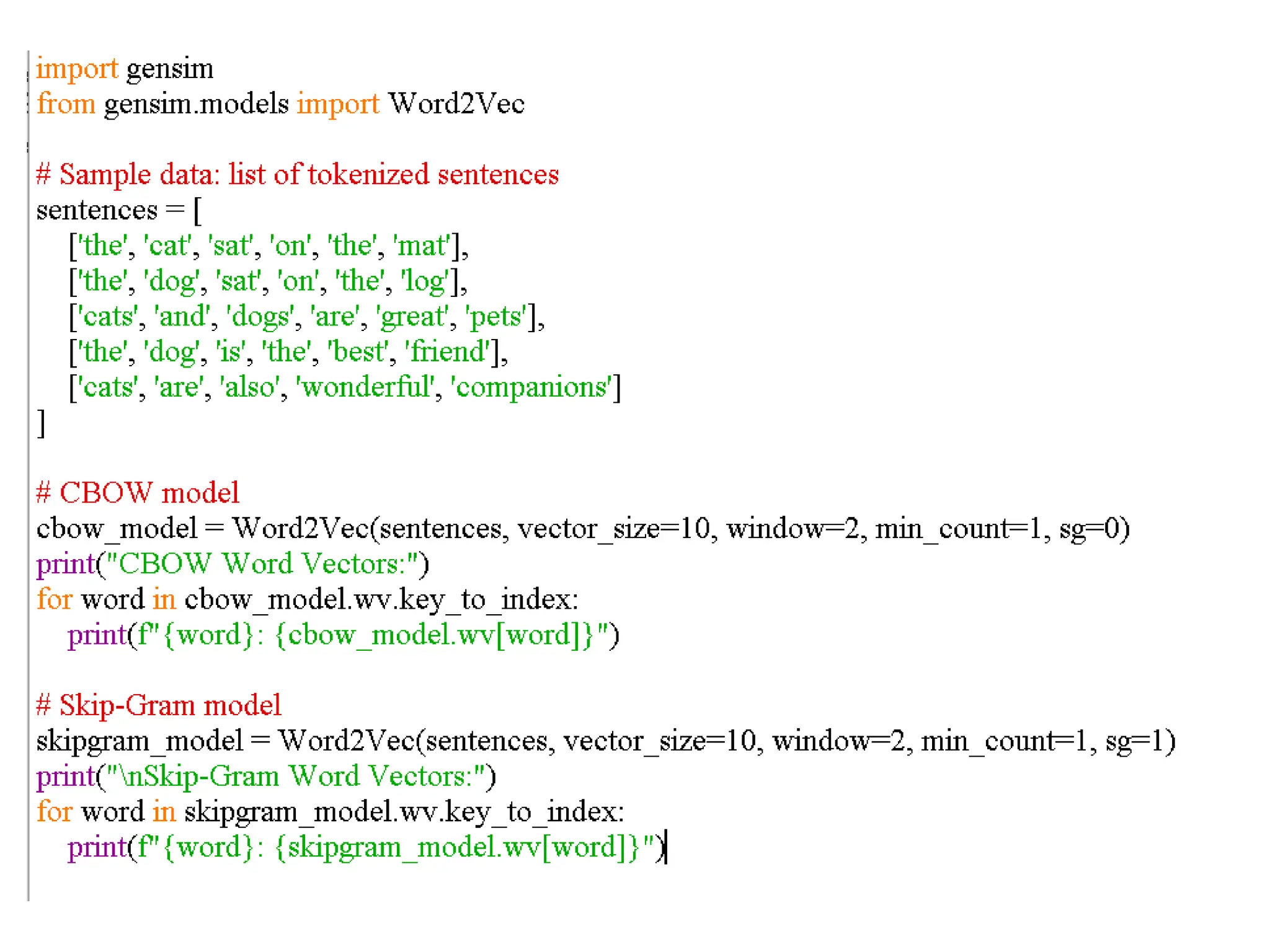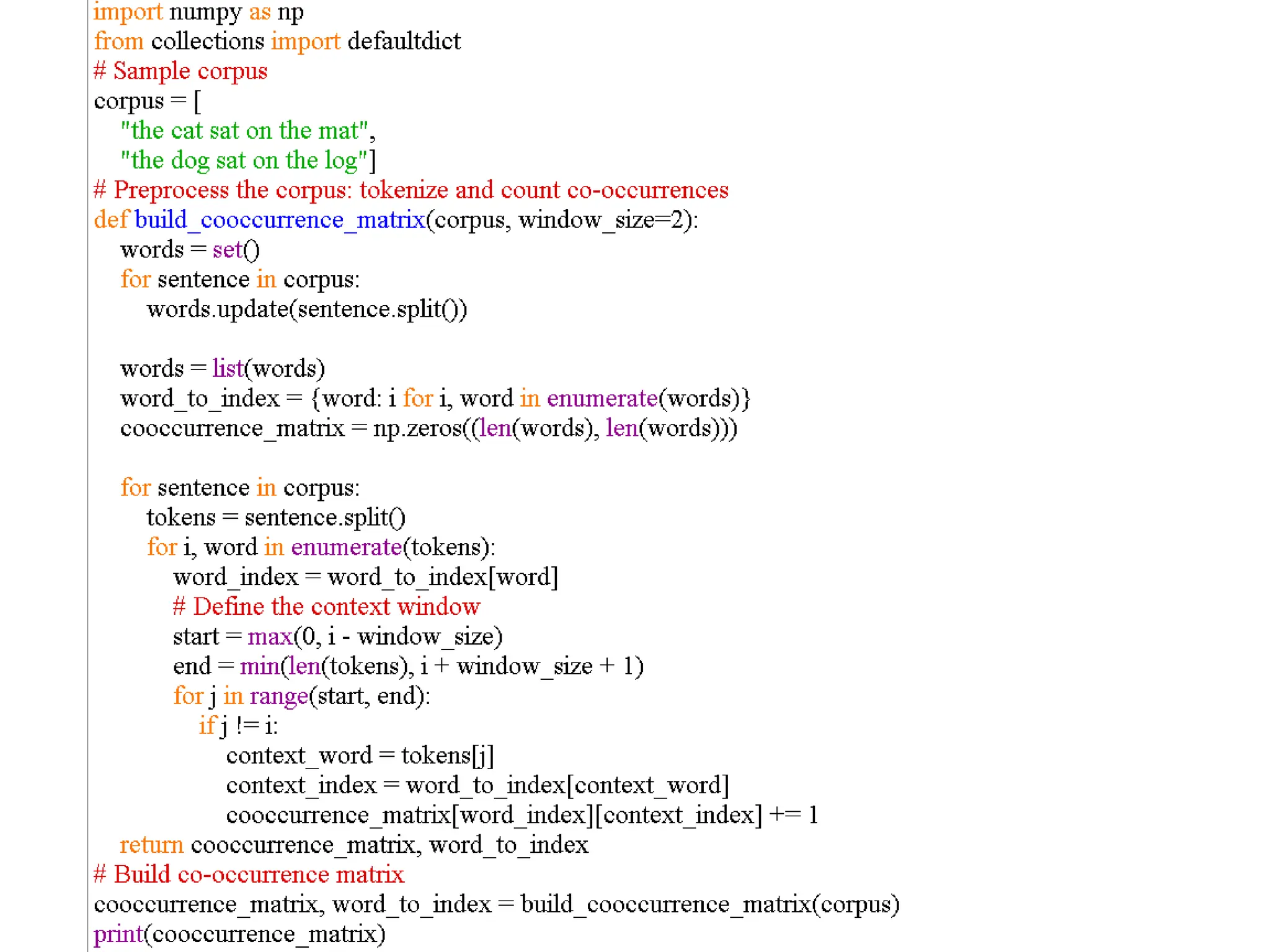 1. Data Preparation:The code tokenizes a small corpus and builds a co-