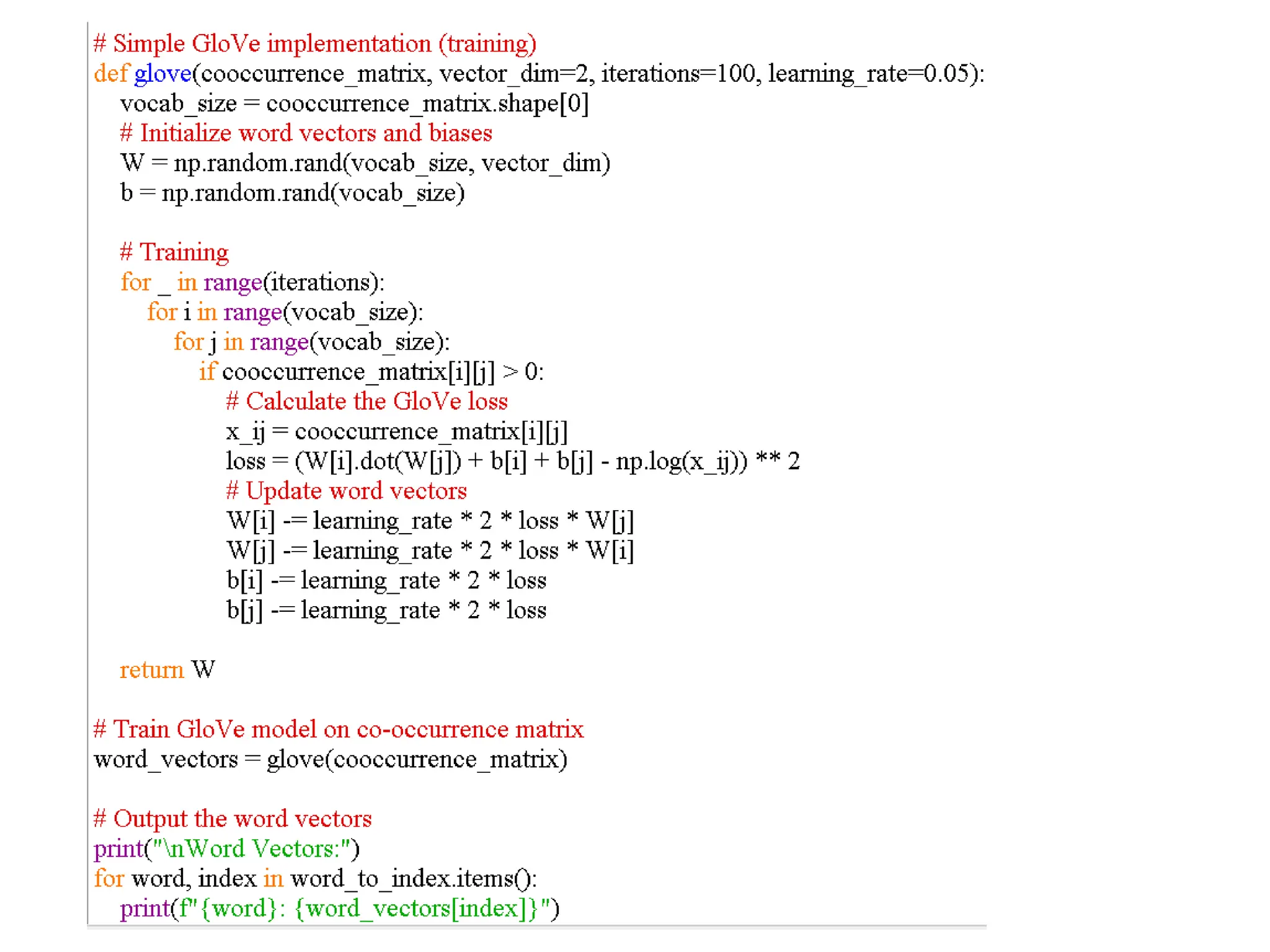 aining: The glovefunction implements a simplified version of the GloVe training process, updating word vectors based on the GloVe loss function.