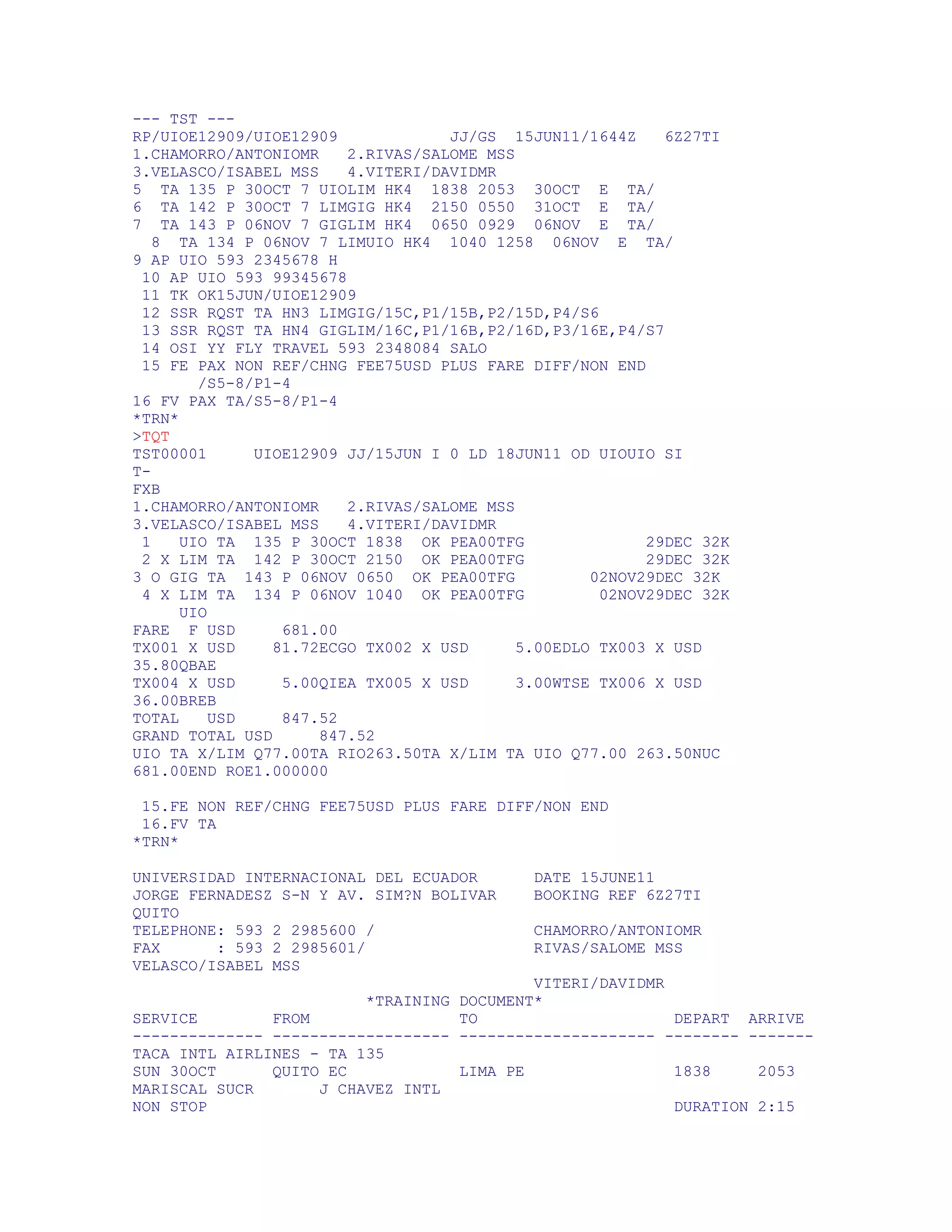 This document contains a flight itinerary for 4 passengers traveling from Quito, Ecuador to Rio de Janeiro, Brazil and returning on TACA International Airlines. The itinerary includes flights from Quito to Lima on October 30th, Lima to Rio de Janeiro the same day, Rio de Janeiro to Lima on November 6th, and a return from Lima to Quito on November 6th. Seat assignments and meal services are specified for each leg of the trip.