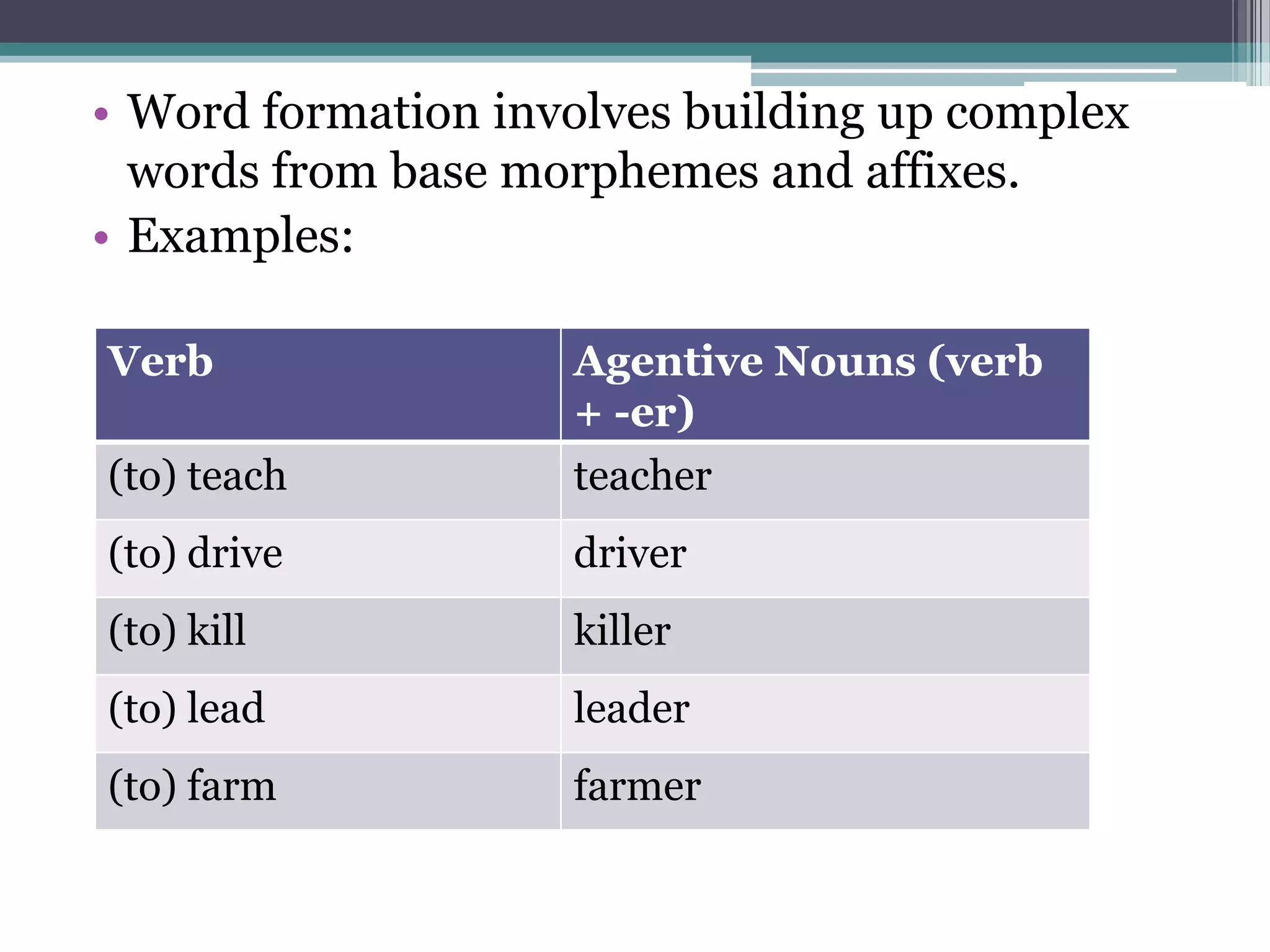 The document discusses word formation through the addition of affixes like suffixes. It provides examples of how verbs can form agentive nouns by adding "-er", and how verbs can form adjectives by adding "-able", following systematic morphological rules. These changes can involve phonological, part-of-speech, and semantic alterations. It notes some verbs can take the "-able" suffix while others cannot, and some nouns can also take "-able".