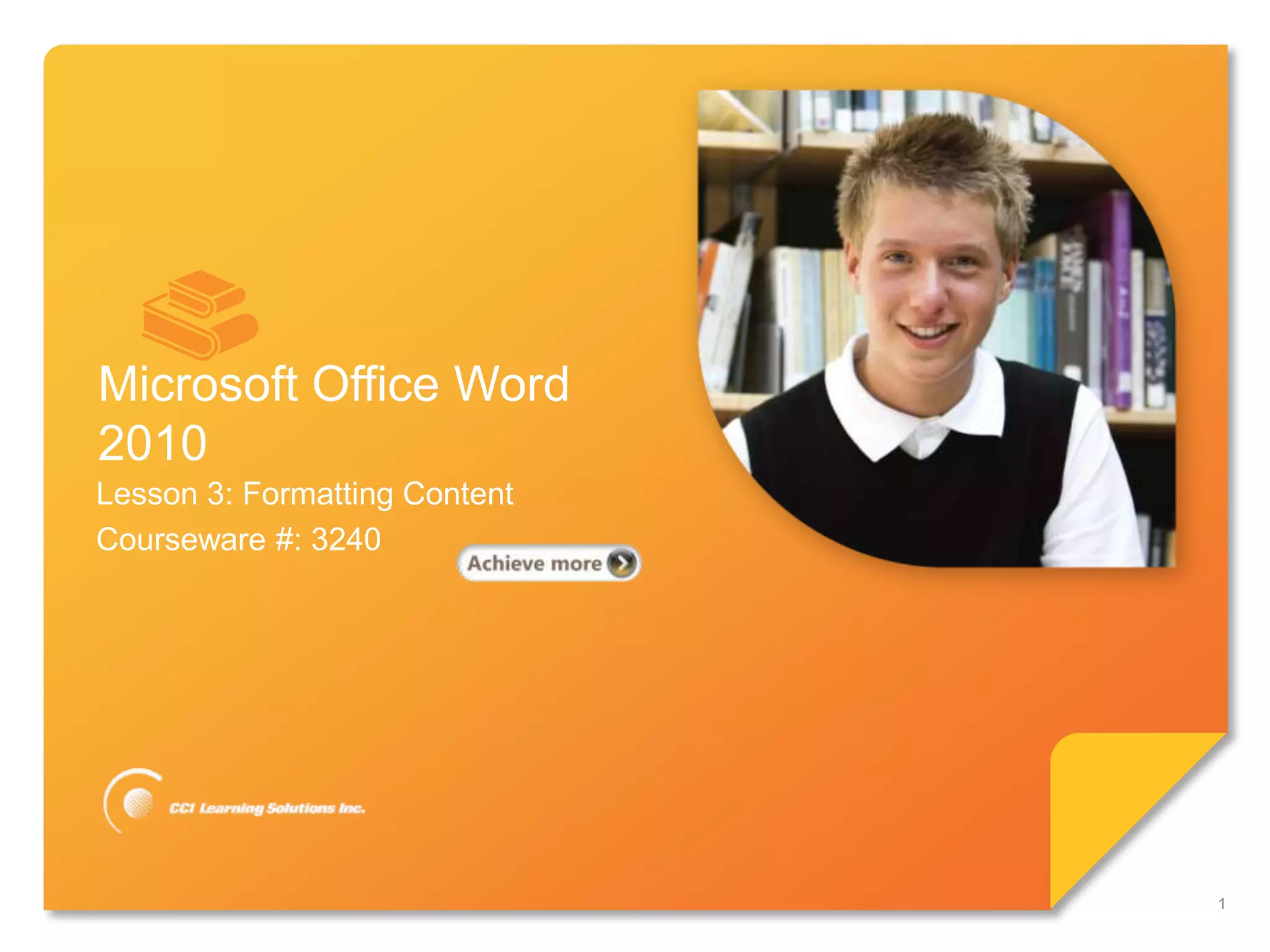 This document provides an overview of formatting content in Microsoft Word 2010. It discusses how to adjust text alignment, indent paragraphs, change line and paragraph spacing, and use the Format Painter. Specifically, it covers aligning text, setting line and paragraph spacing, indenting paragraphs in various styles, adding borders and shading, understanding styles, and applying quick styles. The objectives are to learn how to format text, adjust alignments, modify indents and spacing, and copy formatting.