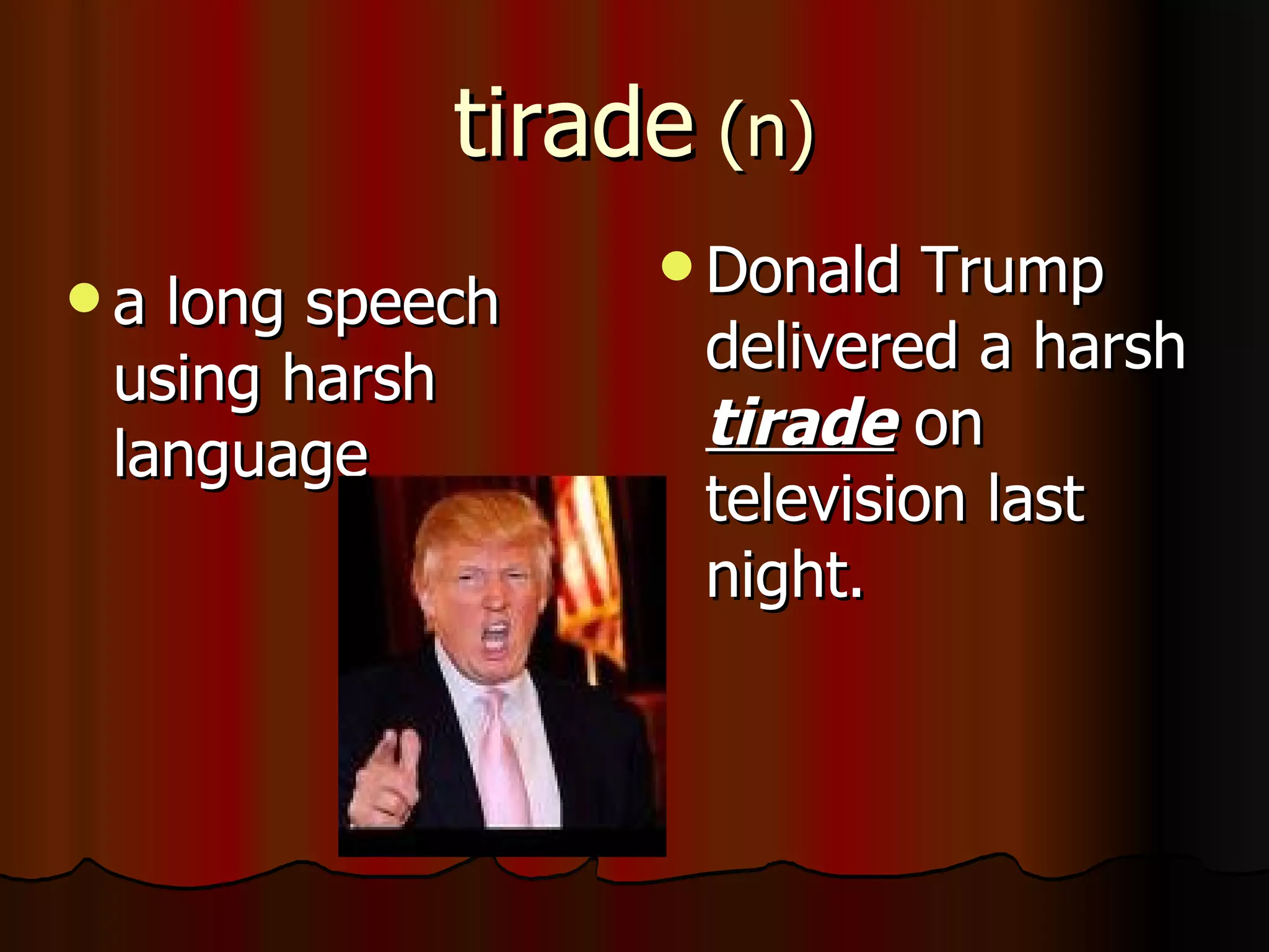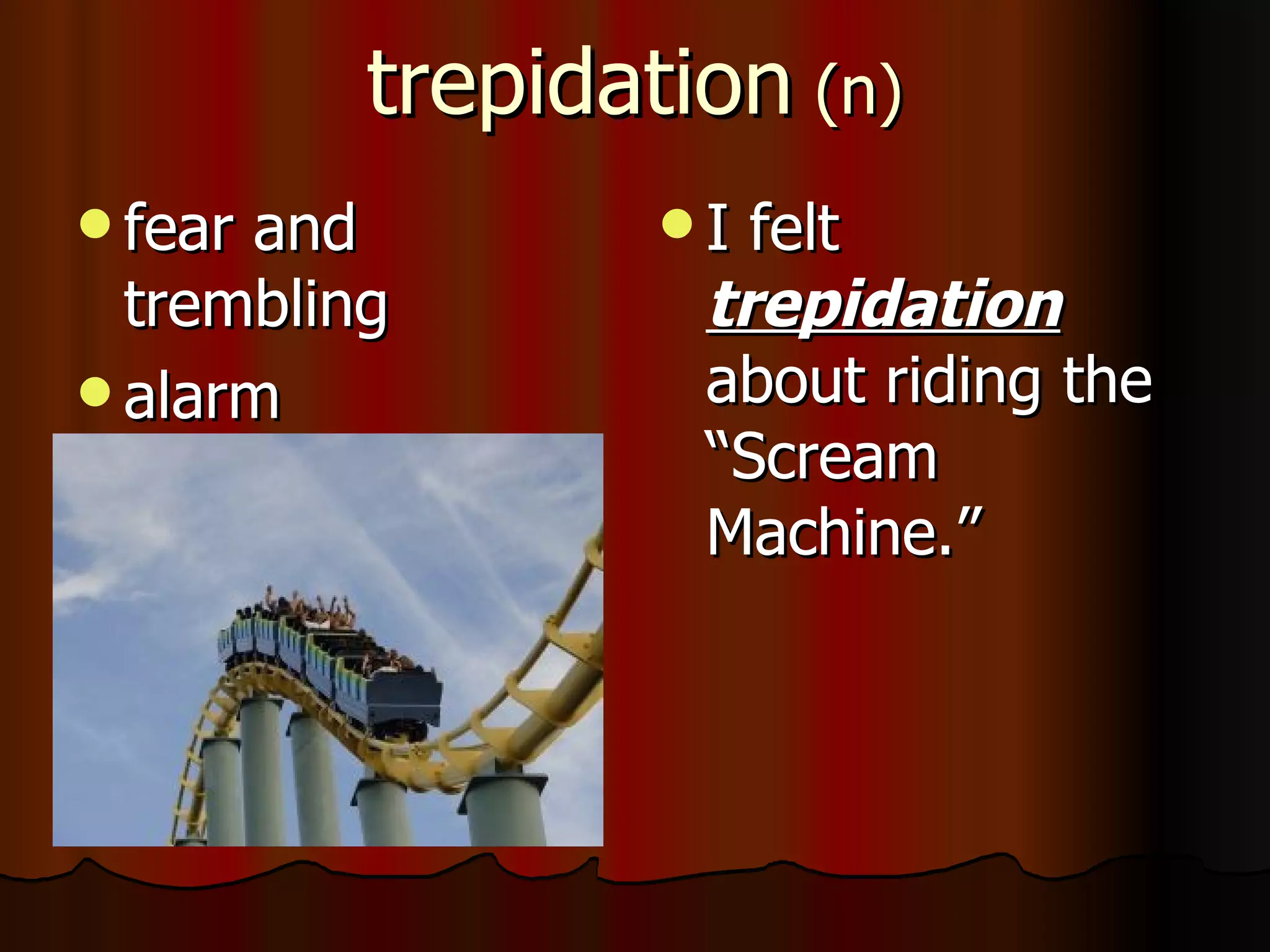 The document defines 20 vocabulary words through examples of how each word is used in a sentence. It provides the definition, part of speech, and a short sample sentence for each of the following words: trepidation, tirade, adulation, admonish, impede, incandescent, plethora, proximity, opaque, obstinate, docile, diligent, redundant, ravenous, concur, debacle, garrulous, guile, elude, emulate.