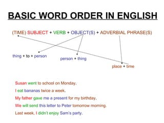 The document outlines the basic word order in English, emphasizing the typical structure of sentences as subject-verb-object along with the positioning of adverbs and adjectives. It provides guidelines for the correct order of adjectives within noun phrases, including a specific sequence for various types of adjectives. Additionally, it discusses the placement of adverbs in sentences, including their position relative to verbs and their categorization based on frequency, certainty, and manner.