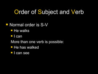 The document discusses the order of subject, verb, and object in English sentences, emphasizing the normal structure of S-V, S-V-O, and V-O. It includes explanations of adverb placement, specifically for adverbs of frequency and manner, noting exceptions for certain constructions. Additionally, it advises against using 'there' in constructions that can be rephrased for clarity.