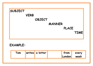 This document provides examples of how adverbs are positioned in sentences. It shows that adverbs like always, already, often, just, usually, still, sometimes, ever, also, rarely, both, seldom, and never can be placed before verbs, after forms of "to be", or between two verbs. Specific examples are given to illustrate each position, such as "I always have breakfast at home" and "We are rarely at home in the morning."