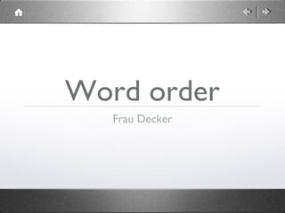 The document discusses word order rules in German sentences. It states that in declarative sentences, the verb must be in second position, after the subject. It provides examples of how word order changes as other elements are moved around in the sentence, but the verb always remains in second position. The same rules apply when forming questions - either the question word phrase goes first followed by the verb and subject, or for yes/no questions the subject and verb are switched with the verb coming first.