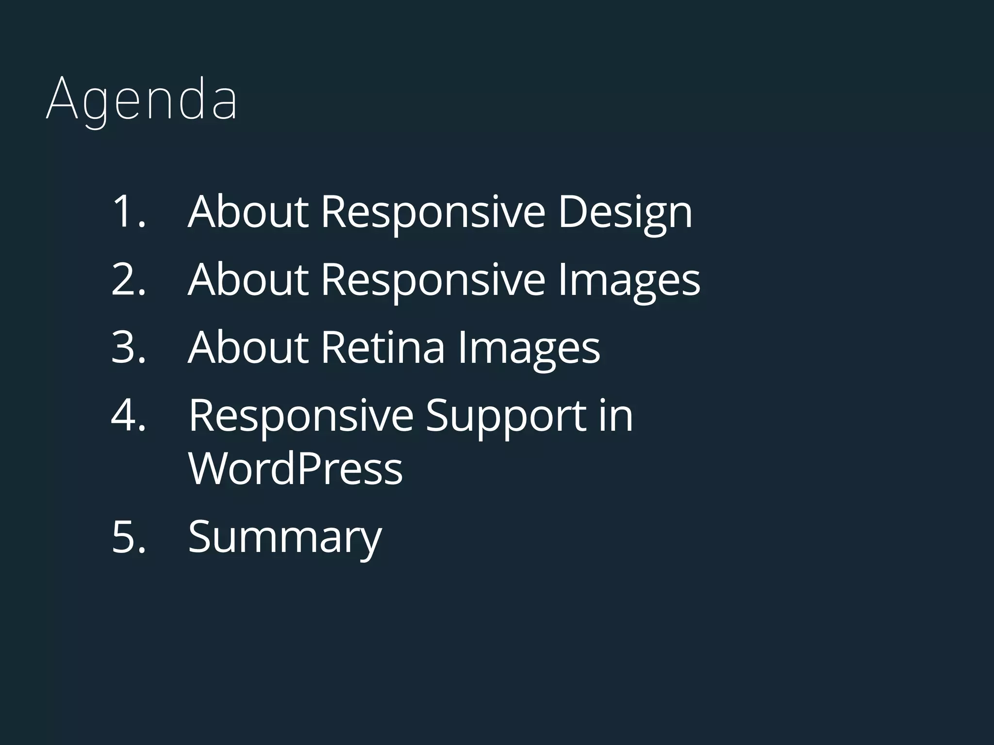 Responsive design tailors layouts for different screen sizes using techniques like media queries and flexible widths. Responsive images choose the best-sized image for each screen resolution using the srcset and sizes attributes. Retina images provide higher resolution versions for high pixel density displays. WordPress has built-in responsive image support through srcset and intermediate image sizes, but themes must implement these features for non-media images.