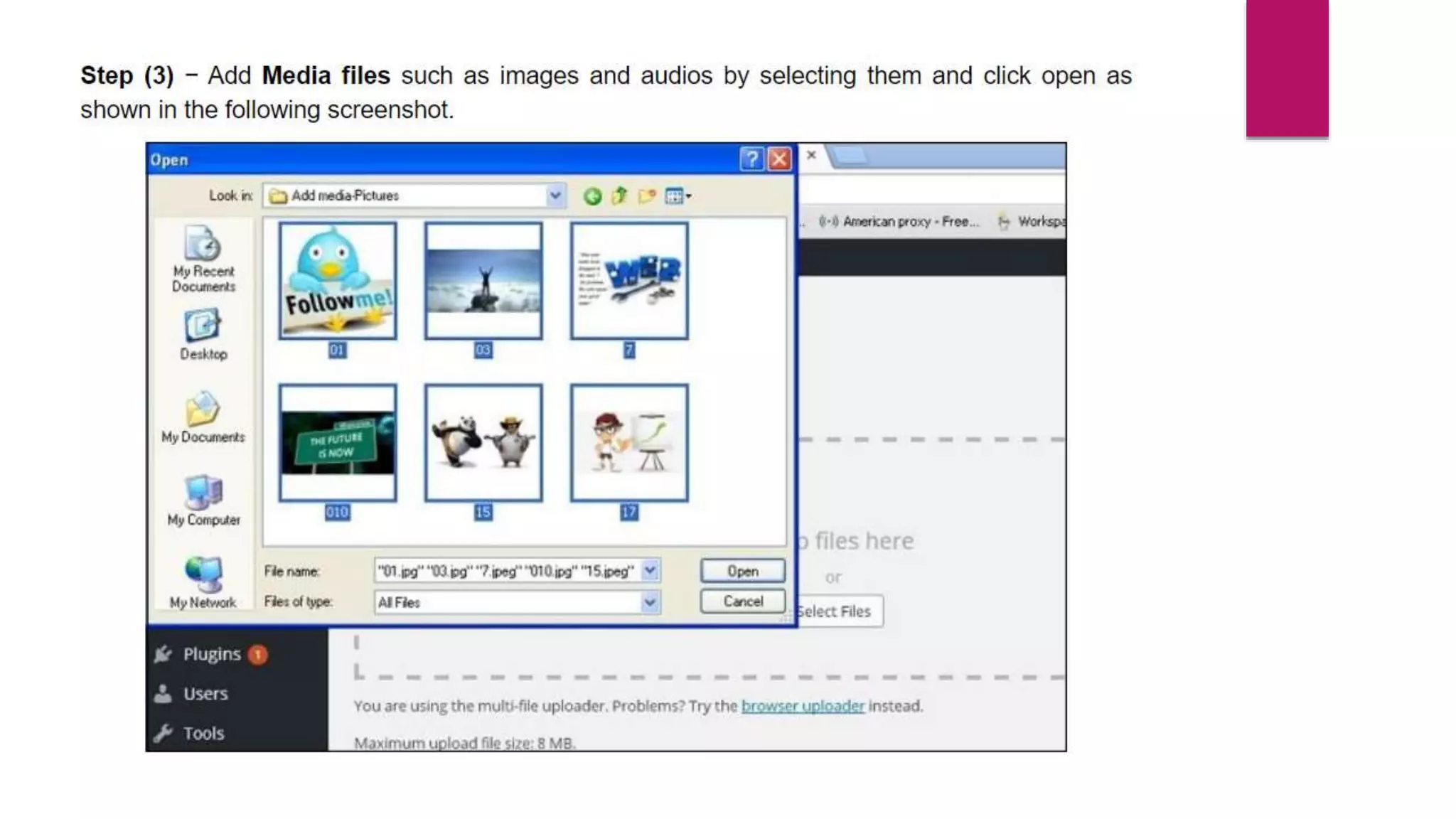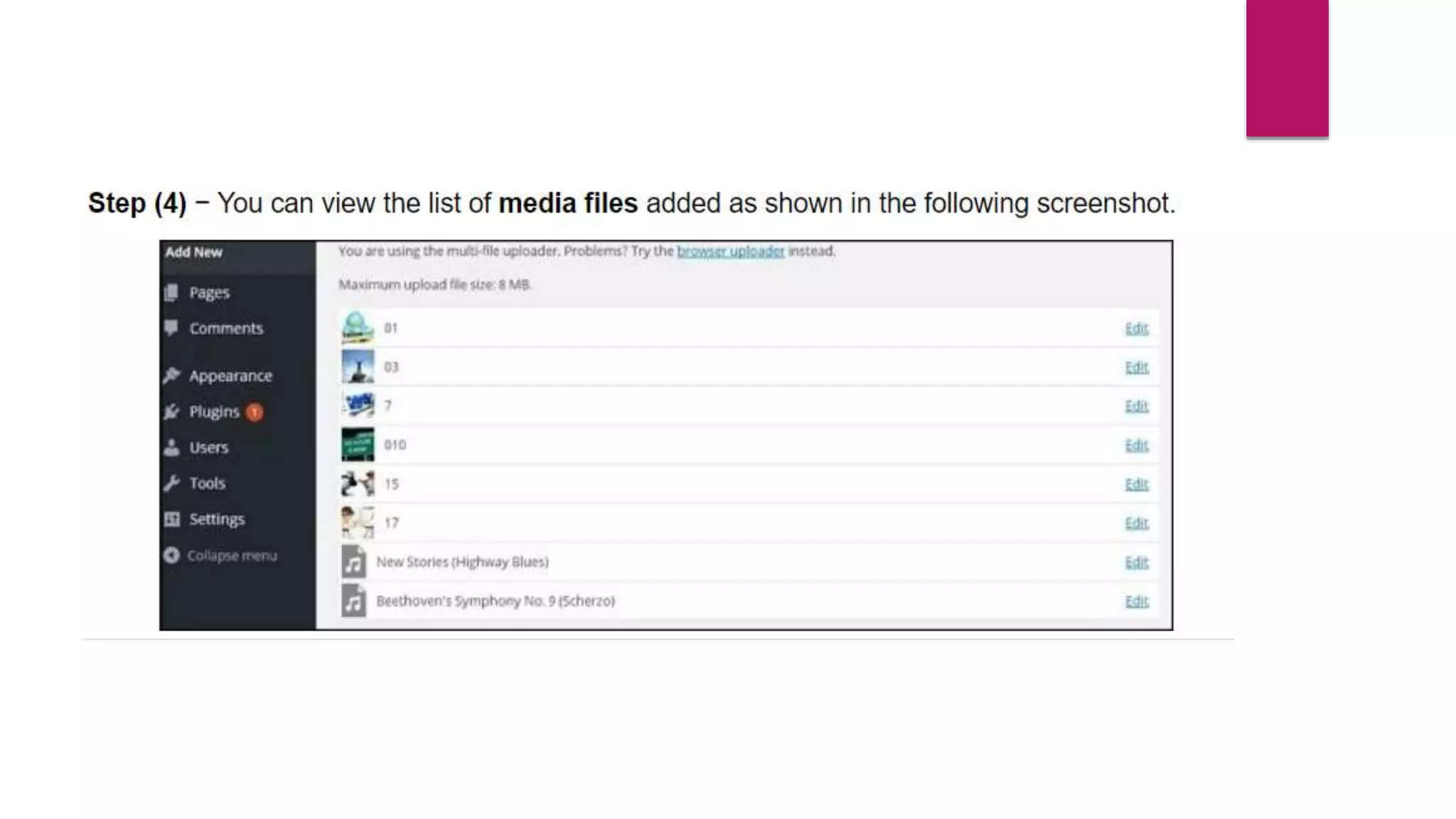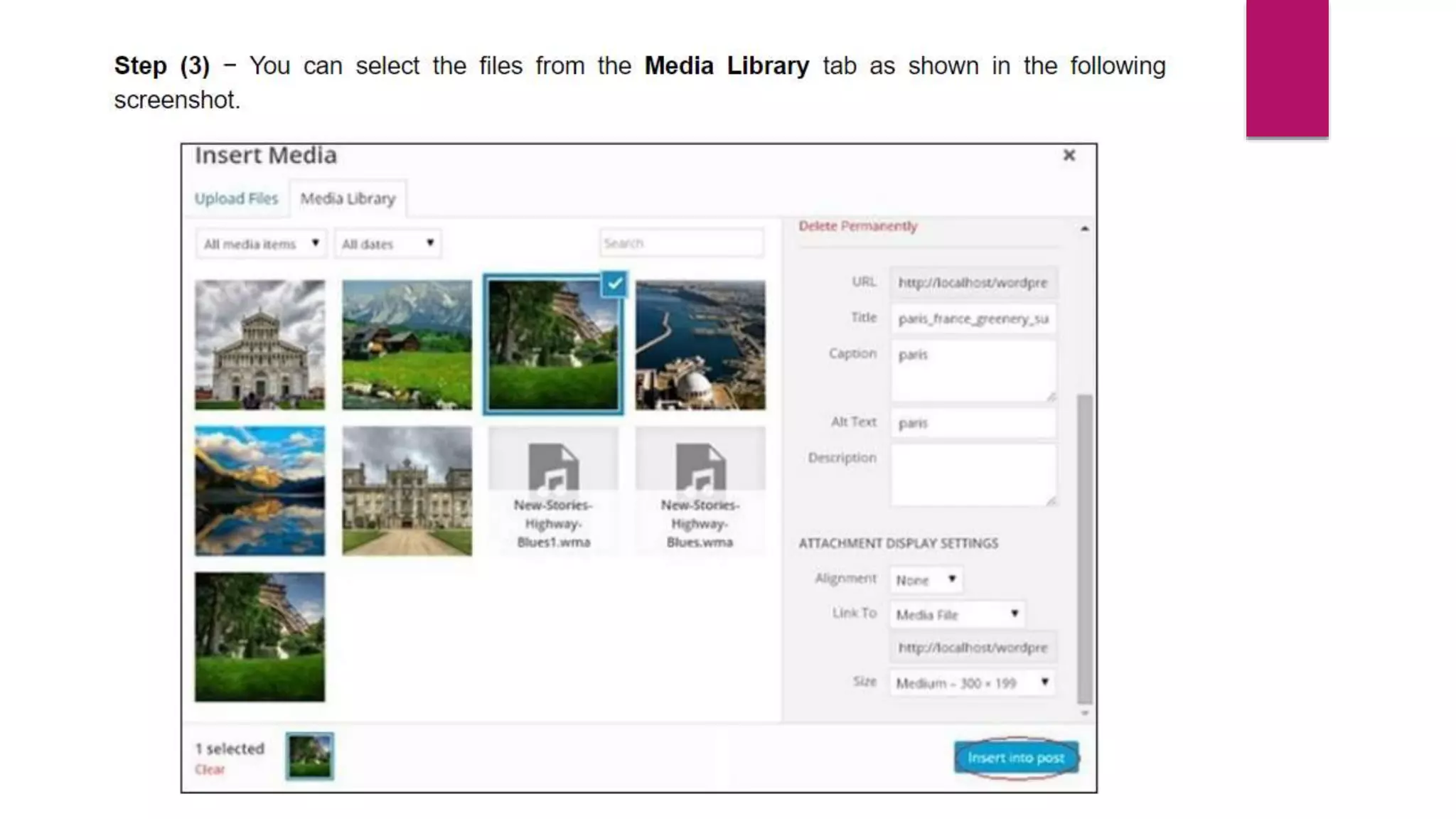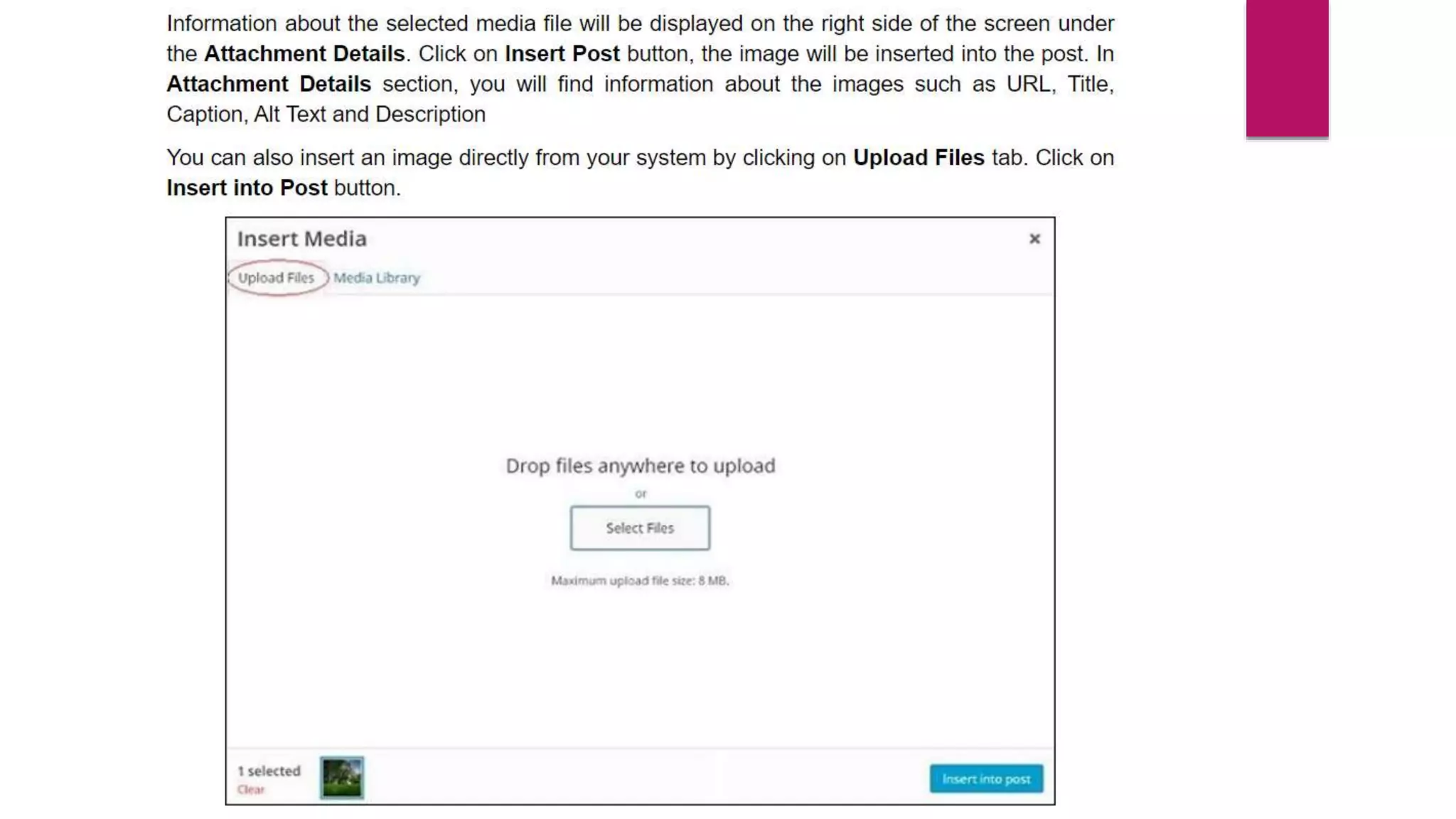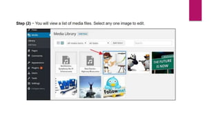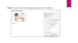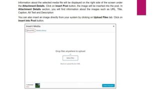 WordPress allows you to add, insert, and edit media files. When adding or editing media, you can specify properties like the URL, title, permalink, caption, alternate text, and description. The media can also be edited by rotating, scaling, cropping, or flipping the image. Files can be permanently deleted from the WordPress media library.