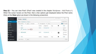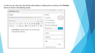 WordPress allows users to preview posts before publishing them to check for errors or unwanted content. Users can then choose to publish the post which will make it visible to the public on the website or save it as a draft. WordPress separates the preview and publishing of posts to allow for quality control before exposing content.
