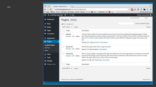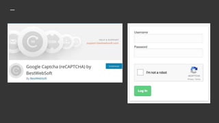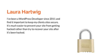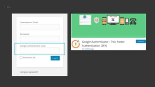 This document provides a guide to securing WordPress sites in 9 steps: 1) Choose a good host, 2) Keep your site updated, 3) Use strong usernames and passwords, 4) Remove unwanted users, 5) Use security plugins, 6) Backups, 7) Get notified of issues, 8) Protect your own security, and 9) Know what to do if hacked. WordPress powers many websites but this open source software is a target, so site owners must choose a security level based on resources and site value. Regular backups, software updates, and password protection are key to prevention, while monitoring and incident response plans can address any issues.