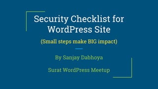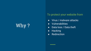 The document outlines a comprehensive security checklist for WordPress sites, focusing on prevention against virus attacks, data theft, and various vulnerabilities. Key recommendations include updating themes and plugins, using strong passwords, implementing SSL, and utilizing two-factor authentication. It emphasizes the importance of regular security scans and user management to mitigate hacking risks.