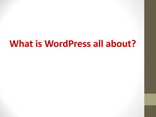 The document provides a step-by-step guide to learning WordPress. It discusses widgets, menus, plugins, accessing the dashboard, creating posts and pages, adding images and videos, categories and tags, and basic WordPress settings. The guide explains how to customize the sidebar, create navigation menus, add functionality through plugins, and navigate the backend interface. It also outlines how to write, format and publish new content on the site.