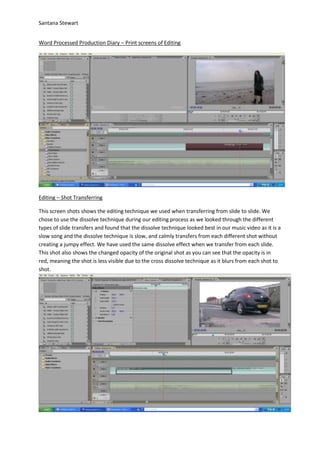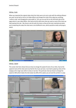This document discusses editing techniques used in a music video project. It describes using a dissolve transition between shots to smoothly transfer between them without a jumpy effect, as the song is slow. Shots were resized to match the editing software's scale. Some shot speeds were adjusted, slowing down faster shots by 50% or speeding up slower shots by 20% to match the music. One shot was changed to black and white to symbolize heartbreak and create a dreary effect.