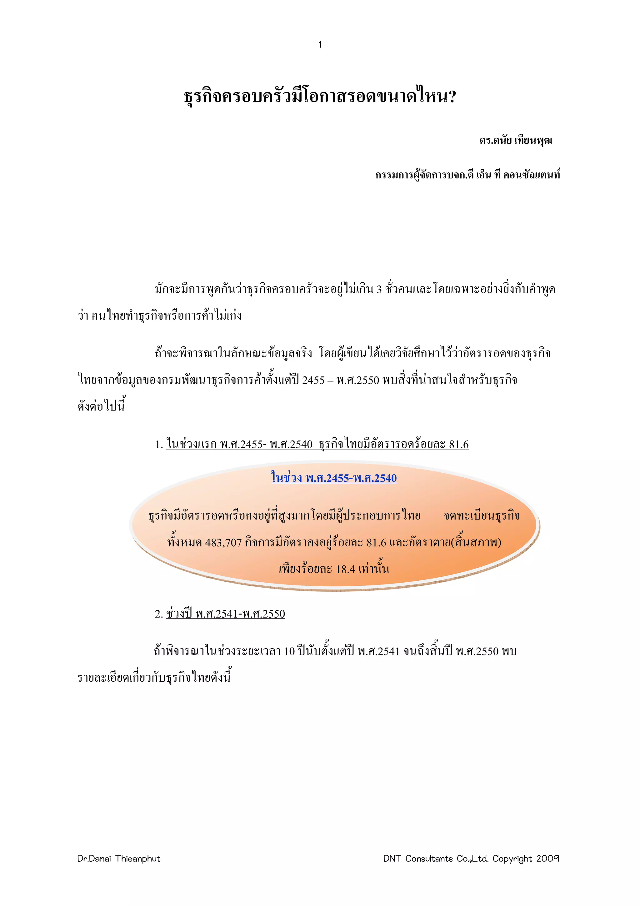 ธุรกิจครอบครัวมีโอกาสรอดขนาดไหน? ดร.ดนัย เทียนพุฒ กรรมการผูจัดการบจก.ดี เอ็น ที คอนซัลแตนท มักจะมีการพูดกันวาธุรกิจครอบครัวจะอยูไมเกิน 3 ชัวคนและโดยเฉพาะอยางยิ่งกับคําพูด ่ วา คนไทยทําธุรกิจหรือการคาไมเกง ถาจะพิจารณาในลักษณะขอมูลจริง โดยผูเขียนไดเคยวิจยศึกษาไววาอัตรารอดของธุรกิจ ั ไทยจากขอมูลของกรมพัฒนาธุรกิจการคาตั้งแตป 2455 – พ.ศ.2550 พบสิ่งที่นาสนใจสําหรับธุรกิจ ดังตอไปนี้ 1. ในชวงแรก พ.ศ.2455- พ.ศ.2540 ธุรกิจไทยมีอัตรารอดรอยละ 81.6 ในชวง พ.ศ.2455-พ.ศ.2540 ธุรกิจมีอัตรารอดหรือคงอยูที่สูงมากโดยมีผูประกอบการไทย จดทะเบียนธุรกิจ ทั้งหมด 483,707 กิจการมีอัตราคงอยูรอยละ 81.6 และอัตราตาย(สิ้นสภาพ) เพียงรอยละ 18.4 เทานั้น 2. ชวงป พ.ศ.2541-พ.ศ.2550 ถาพิจารณาในชวงระยะเวลา 10 ปนับตั้งแตป พ.ศ.2541 จนถึงสิ้นป พ.ศ.2550 พบ รายละเอียดเกียวกับธุรกิจไทยดังนี้ ่ Dr.Danai Thieanphut DNT Consultants Co.,Ltd. Copyright 2009