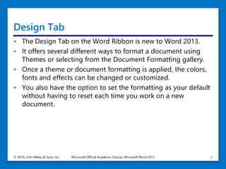 1. The document discusses various formatting options in Microsoft Word 2013 including themes, styles, colors, effects, paragraphs, style sets, page colors, watermarks, borders, building blocks, equations, fields, auto text, text boxes, drop caps, and special characters.