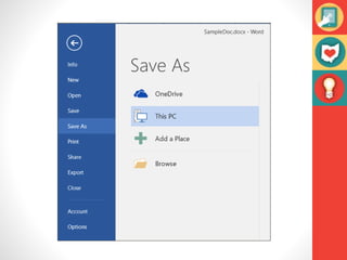 This document provides an overview of the key features and interface of Microsoft Word 2016, including: