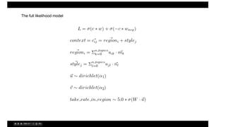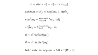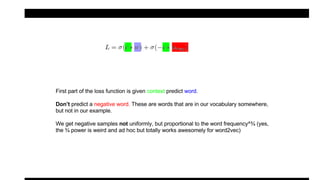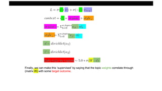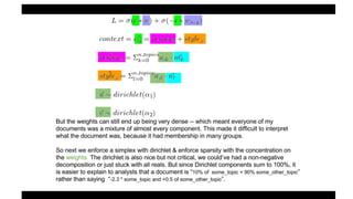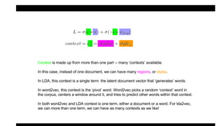 This document summarizes the lda2vec model, which combines aspects of word2vec and LDA. Word2vec learns word embeddings based on local context, while LDA learns document-level topic mixtures. Lda2vec models words based on both their local context and global document topic mixtures to leverage both approaches. It represents documents as mixtures over sparse topic vectors similar to LDA to maintain interpretability. This allows it to predict words based on local context and global document content.