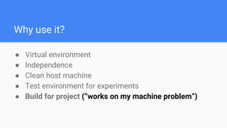 This document discusses why Docker is useful for creating consistent and isolated development environments. Docker allows independence from the host machine by providing a clean environment to test projects. It can be used to build environments for specific projects, avoiding issues caused by differences in local machines ("works on my machine" problem). Docker images can also be used as test environments by pulling pre-built databases and apps. The document recommends Docker for running legacy projects in a consistent way and producing applications that can run anywhere Docker is supported.
