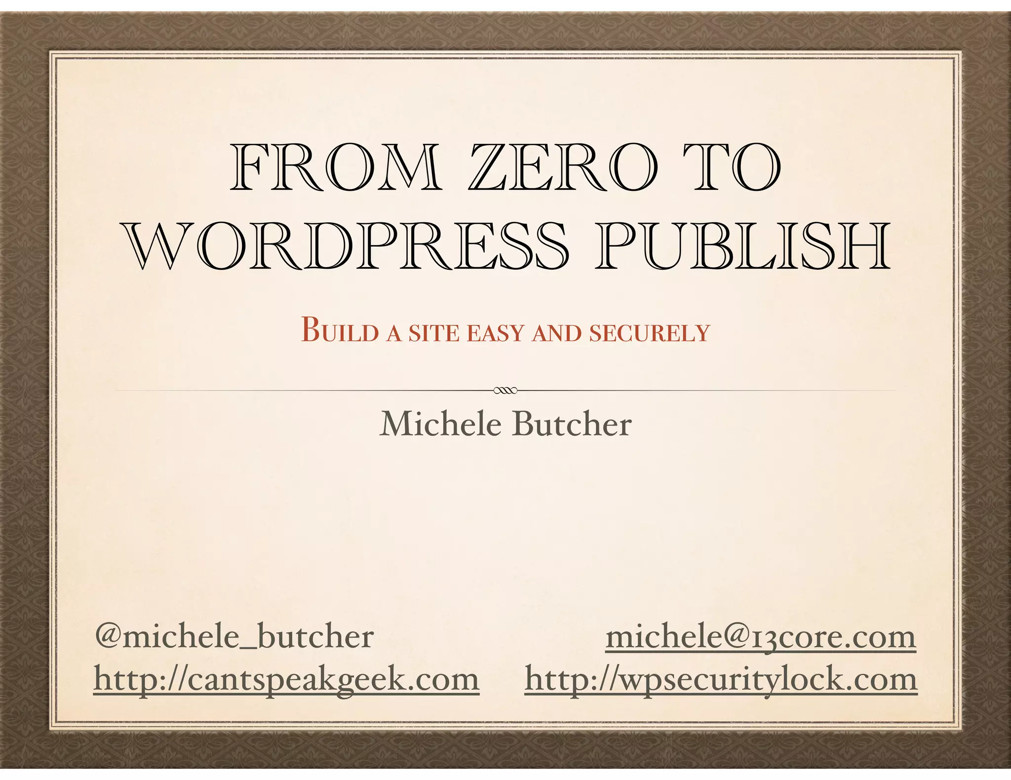 The document provides step-by-step instructions for setting up a WordPress site from scratch, including choosing a domain name and hosting, installing WordPress, and completing the initial site configuration. It discusses domain extensions, hosting options, installing WordPress files, creating a database, going through the installation wizard, and logging into the WordPress dashboard for the first time. The overall process and various options are explained concisely to help a new user publish their first WordPress site.