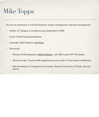 Michael Toppa's presentation at WordCamp Nashville focuses on the importance of clean code in WordPress development, emphasizing principles that promote code organization, clarity, and maintainability. He discusses key practices such as meaningful naming, writing expressive code, and the significance of adhering to professional standards to avoid code becoming unmanageable. Toppa argues for the necessity of developing clean code habits to enhance flexibility and speed in software development while preventing complications down the line.